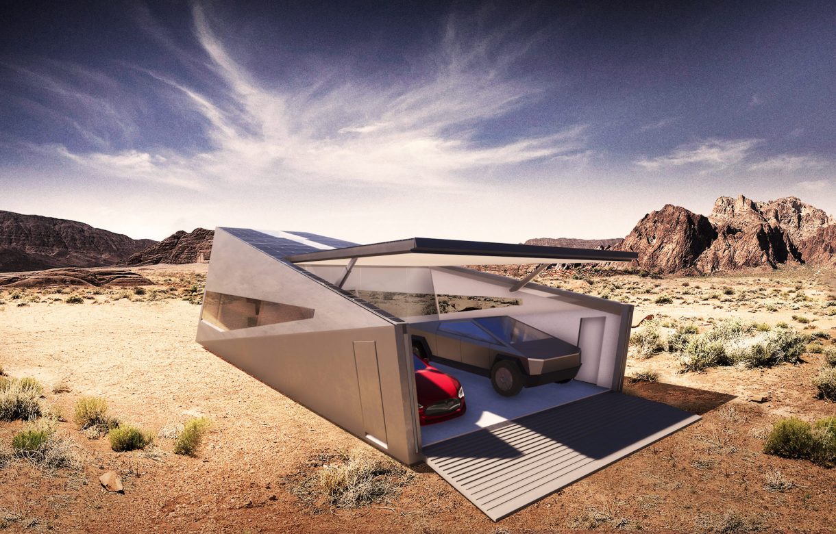 Tomando como inspiración la Cybertruck, la estructura monocasco de acero rígido de esta edificación hace juego a la perfección con este vehículo. Dos grandes compuertas desplegables permiten el acceso a un espacio interior de 55.7 metros cuadrados, donde es posible aparcar otro vehículo, además de la Cybertruck; o incluso dos Cybertrucks, una al lado de la otra.