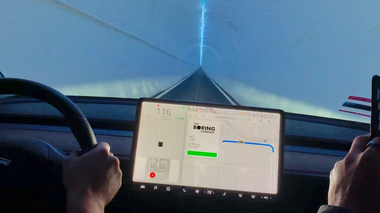 En el vídeo que puedes ver sobre estas líneas, publicado en Twitter, puede verse que Tesla ha desarrollado una nueva interfaz de usuario para sus vehículos que permite desplazarse a través del túnel de un punto a otro, simplemente pulsando el botón «Start». Al hacerlo, el coche comenzará a circular autónomamente por el interior del túnel a una velocidad máxima de 90 millas por hora (145 km/h).